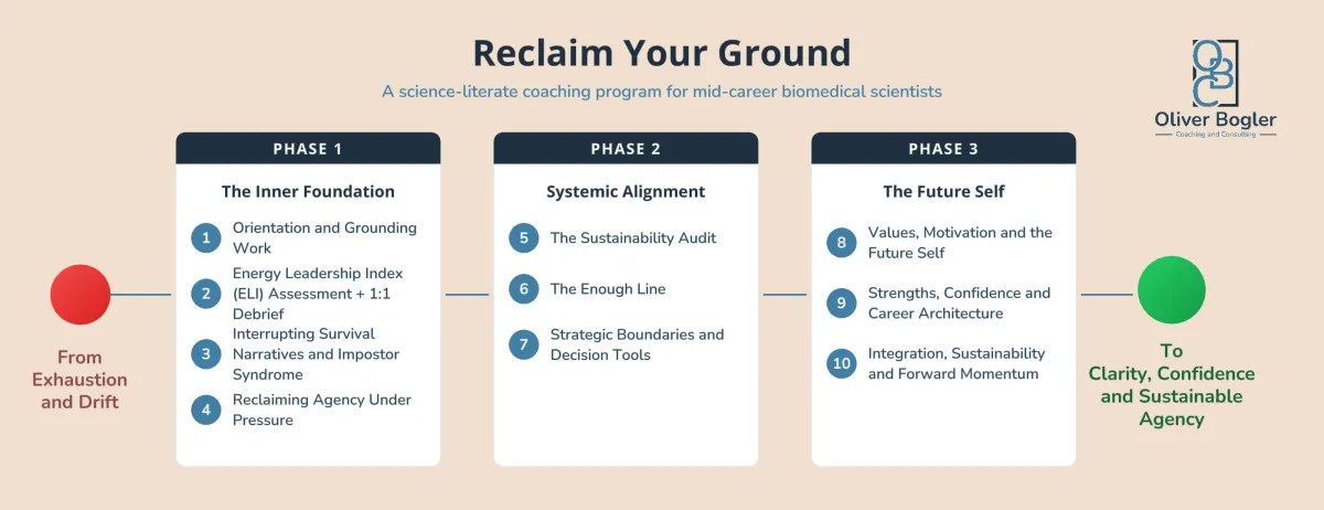 Ten 1 hour 1:1 Sessions over ~3 months divided into three phases, that take you from exhaustion and drift to clarity, confidence and sustainable agency.